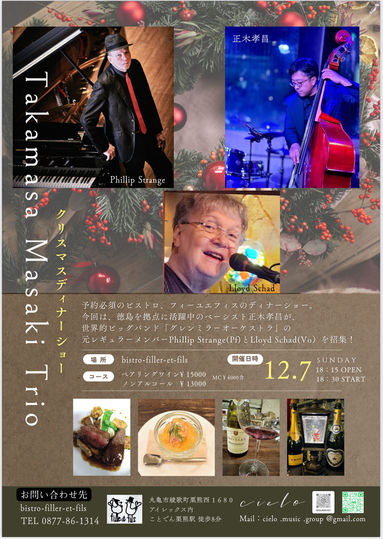 徳島を中心に活躍するベーシスト正木孝昌率いるtrioの演奏を聞きながらフィーユエフィスのお料理とペアリングングワインを楽しみませんか?